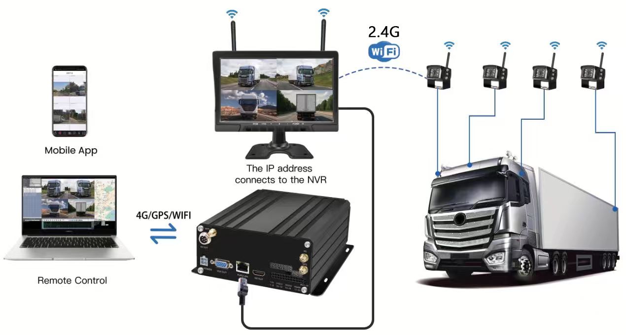 Камера наблюдения за водителем AHD в салонеCarleader 10,1-дюймовая 4-канальная беспроводная мобильная система NVR с жестким диском, передовая мобильная система NVR, предназначенная для управления автопарком. В системе используются 4 беспроводных IP-камеры, которые соединяются с 10,1-дюймовым проводным монитором через сигнал 2,4 ГГц, а затем подключают монитор и сетевой видеорегистратор с помощью разъема RJ45. нет необходимости в дополнительных проблемах с проводкой, более эффективно при установке и управлении автопарком.