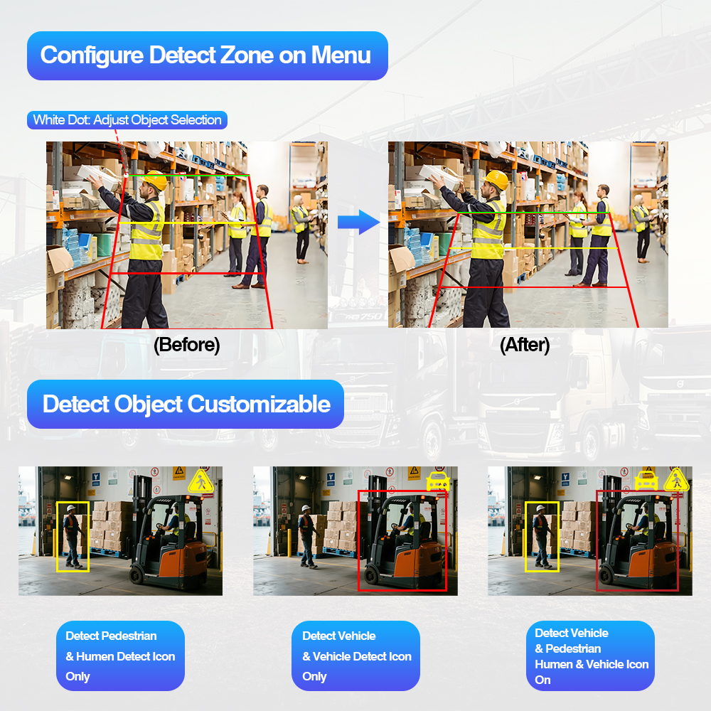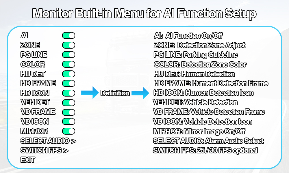 Камера заднего вида с функцией обнаружения слепых зон с искусственным интеллектом, встроенная сигнальная лампа изменения цветаСистема камер обнаружения слепых зон с искусственным интеллектом. Встроенная сигнальная лампа изменения цвета — это интеллектуальный набор для обеспечения безопасности транспортного средства, который включает в себя камеру AI BSD и монитор AI, которые поддерживают настройку калибровки AI, позволяют пользователю изменять настройки AI, такие как регулировка размера зоны обнаружения, выбор типа звуковой сигнализации, включение/выключение обнаружения пешеходов, включение/выключение обнаружения транспортных средств и любые другие настройки калибровки.