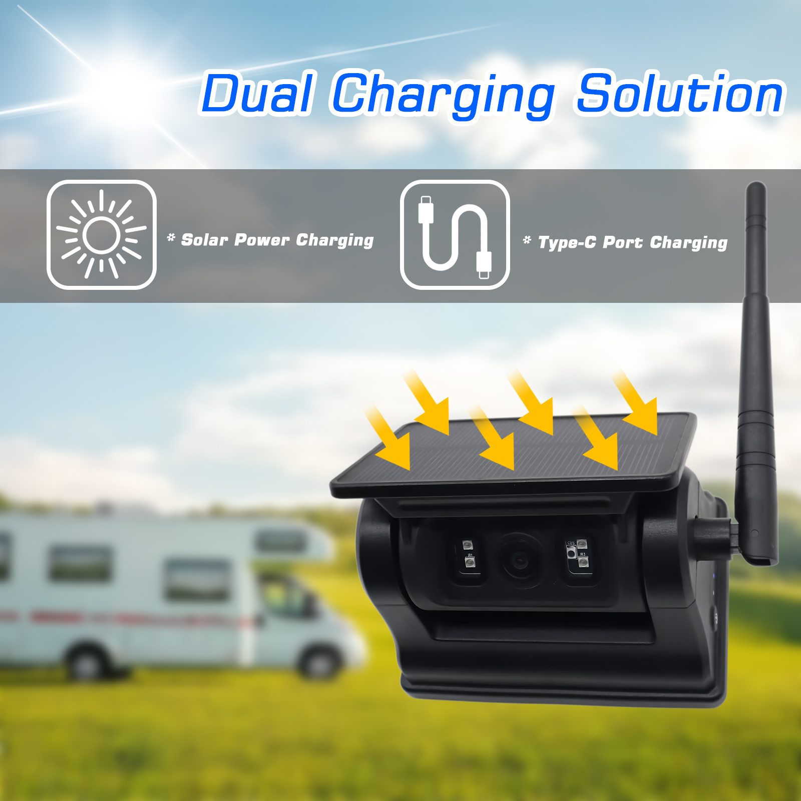 Солнечная энергия: встроенная Аккумулятор большой емкости 10500 мАч, поддержка солнечной энергии и зарядный порт Type-C для подзарядки.