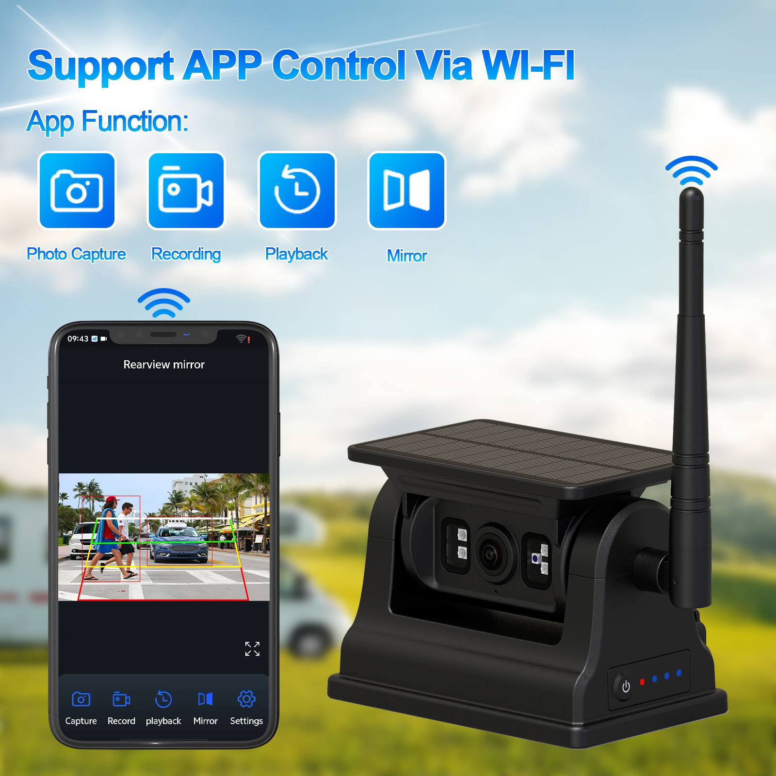 9-дюймовый IPS 2AV AHD автомобильный монитор с поддержкой мультимедиа CarPlayКарлидер Перезаряжаемая реверсивная WIFI-камера AI с солнечной батареей и магнитным основанием, проводка не требуется, простая установка с магнитным основанием, беспроводная камера заднего вида на солнечной энергии, встроенная аккумуляторная батарея большой емкости 10500 мАч и функция ночного видения, также может питаться от солнечной энергии, энергосбережения и защиты окружающей среды. Камера поддерживает функцию обнаружения AI, может обнаруживать пешеходов и транспортные средства, а такжеподдержка подключения к мобильному телефону через WIFI, позволяет пользователю захватывать изображения, записывать видео и воспроизводить его, а также настраивать калибровку AI и т. д. Эта камера — лучший вариант оборудования для мониторинга безопасности транспортного средства, позволяющего безопасно управлять автомобилем.