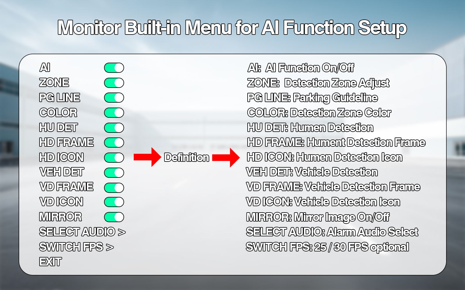 4. Монитор поддерживает интеллектуальную регулировку всех функций, таких как область предупреждения AI BSD камеры BSD.
