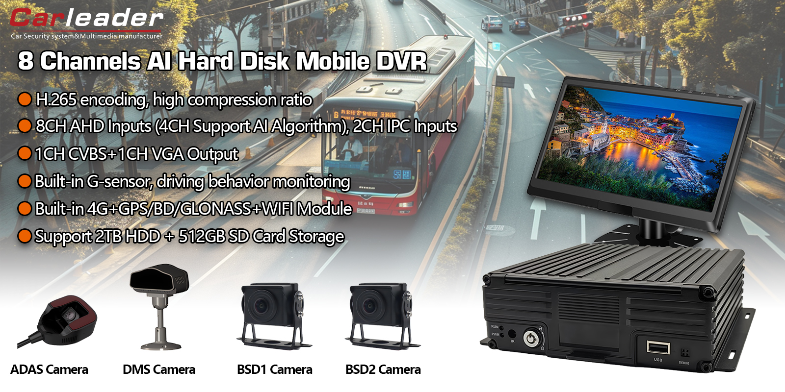 Карлидер8-канальный мобильный видеорегистратор с искусственным интеллектом и жестким диском, поддержка ADAS+DMS+BSDявляется идеальным решением для коммерческих автопарков, общественного транспорта, логистики и специальных транспортных средств, которым требуется:
