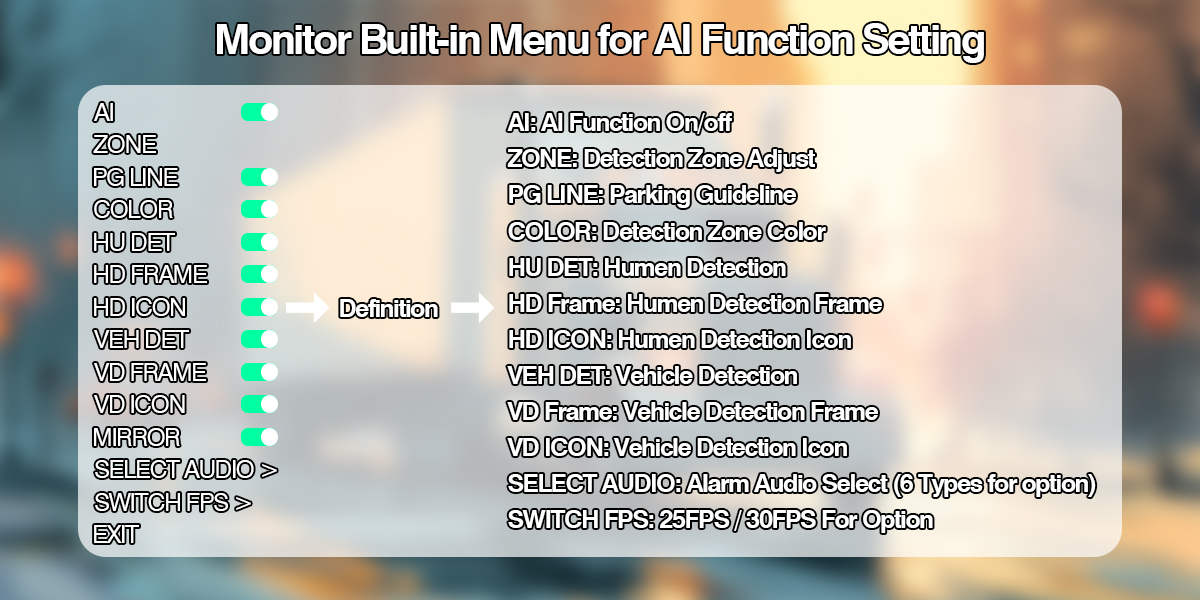 Карлидер7-дюймовая система мониторинга обнаружения слепых зон AI BSD поддерживает калибровку AI, решение камеры с искусственным интеллектом, которое поддерживает обнаружение пешеходов и транспортных средств, значительно повышает безопасность во время вождения, монитор со встроенным меню калибровки искусственного интеллекта, позволяет пользователю настраивать зону обнаружения, включение/выключение цветового отображения зоны обнаружения, тип звукового сигнала тревоги, отображение значков транспортных средств и пешеходов, выбор объекта обнаружения и т. д.