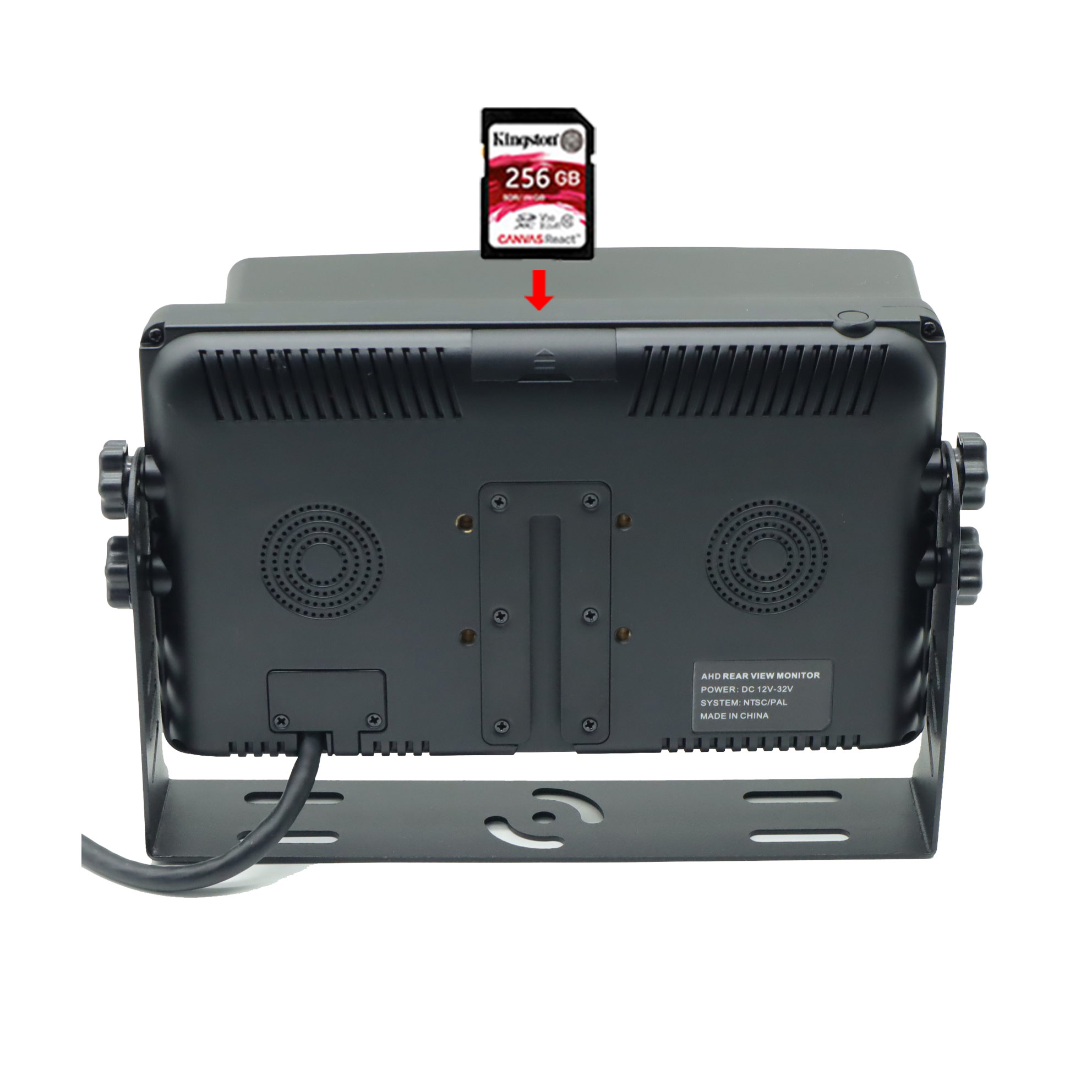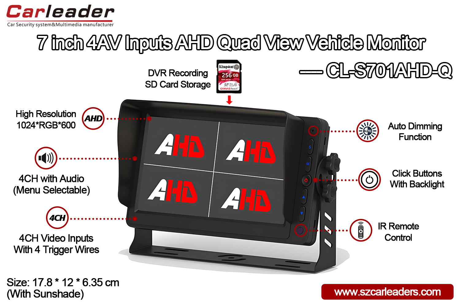 Carleader 7-дюймовый 4-канальный AHD-входы Quad View Монитор поддерживает функцию записи DVR, со слотом для SD-карты на задней панели монитора, максимальная емкость до 256 ГБ. Функции с функцией циклической записи позволяют автоматически записывать и воспроизводить видео с камеры.