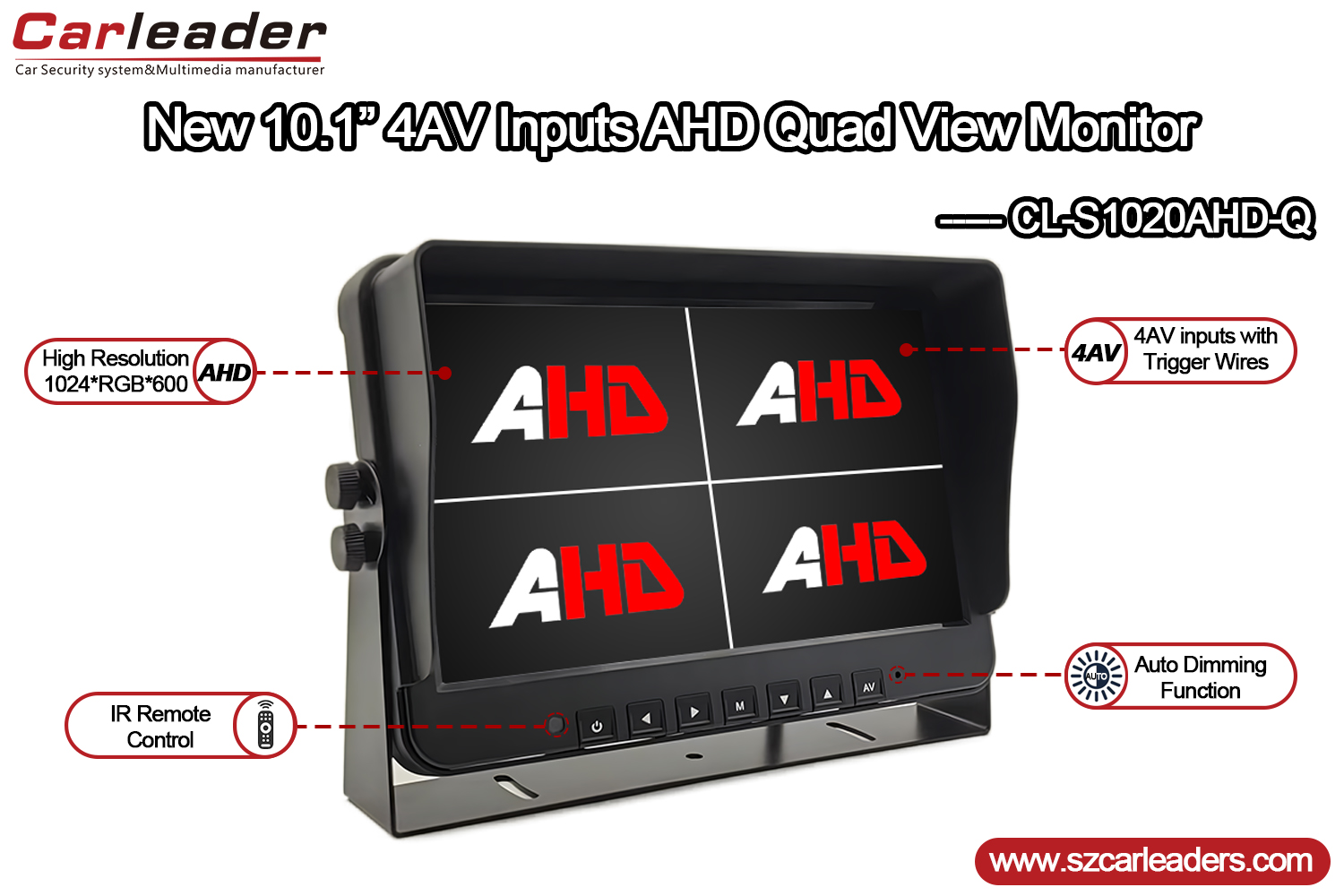 Идеально подходит для транспортных средств, систем безопасности и промышленного мониторинга, Carleader10,1-дюймовый 4-канальный монитор AHD с четырьмя дисплеями для тяжелых условий эксплуатациисочетает в себе надежную функциональность, четкое качество изображения и настраиваемые пользователем параметры в компактном и прочном корпусе.