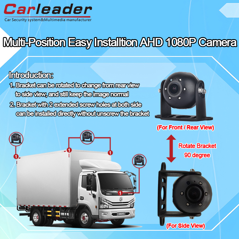 Камера переднего/бокового/заднего вида Carleader AHD для тяжелых транспортных средств с отверстиями для установки кронштейна сверху, снизу, справа и слева, что позволяет камере регулировать кронштейн камеры в соответствии с различным положением камеры, например, передним, боковым и задним видом, что делает эту камеру более совместимой с системой наблюдения за безопасностью транспортных средств.