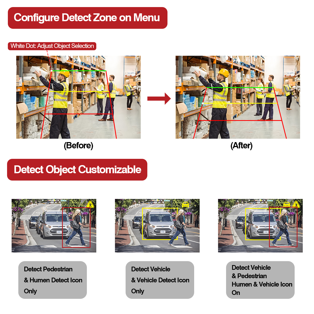 Эта камера с искусственным интеллектом со встроенной функцией сигнальной лампы. Цвет света изменится на соответствующий цвет, когда обнаруженный объект попадет в другую зону обнаружения (красный, желтый, зеленый). Также интегрируйтесь с сигнализацией, чтобы оповещать окружающих пешеходов и транспортных средств, приближающихся к вашему автомобилю.