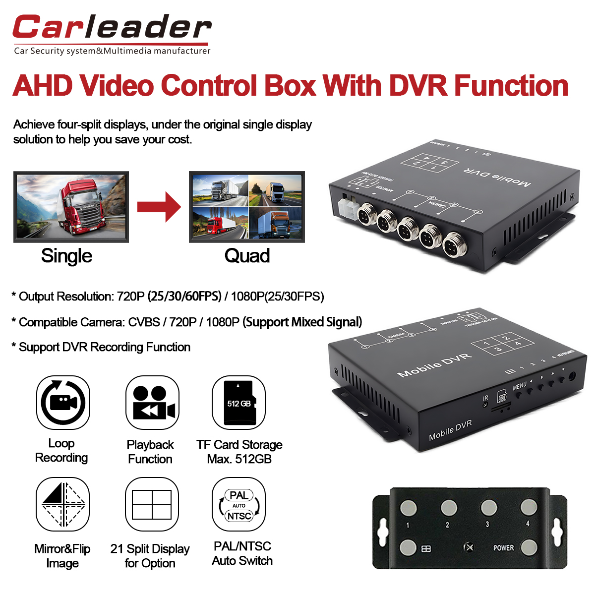 Carleader Quad Video Splitter Box сочетает в себе удобство 4-канального видеоразветвителя с безопасностью функции записи видеорегистратора. Его обширный набор функций, в том числе отдельная настройка изображения, гибкие режимы триггера (триггерный провод и дистанционное управление), регулировка края экрана, широкий диапазон входного напряжения и надежная защита, обеспечивает надежное и высококачественное решение для наблюдения, адаптированное для требовательной мобильной среды. Обеспечьте полную ситуационную осведомленность и безопасность видеодоказательств с помощью видеопроцессора Carleader 1080P AHD с четырьмя разделенными дисплеями и поддержкой записи видео..